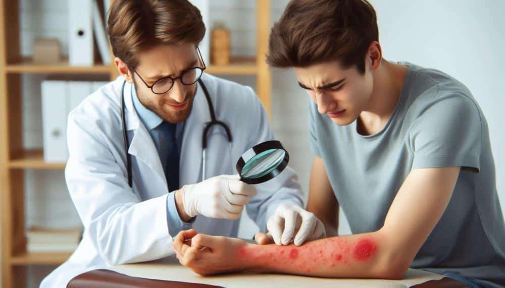 - Urtikaria (Nesselsucht) – mit Quaddelbildung und Juckreiz